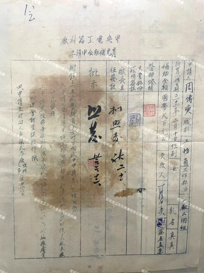 ▲1948年8月中央電工器材廠(昆明電纜集團前身)發(fā)放職工育兒補助金圓券20元。