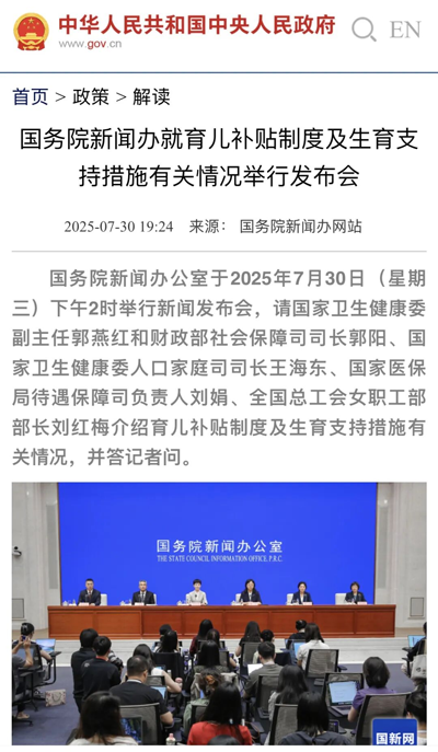 ▲2025年7月30日,中華人民共和國國務(wù)院公布,面向全國家庭,從2025年1月1日起,對所有1至3歲的兒童,均可申領(lǐng)每年3600元人民幣的育兒補貼!